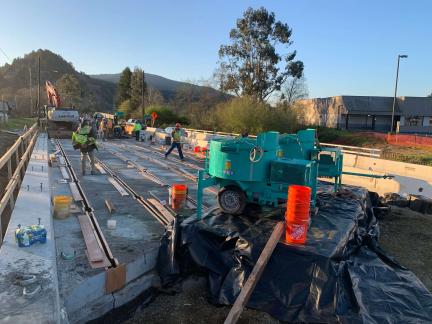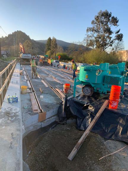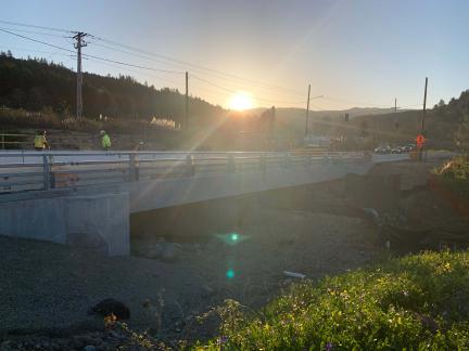 Dominie Creek bridge lies on ancestral territory where Caltrans and Tolowa Dee-ni’ Nation worked together to replace the old dilapidated box culvert structure. The finished bridge has an emblem of spawning salmon at each abutment barrier wall which was inspired by the locations salmon and trout spawning.