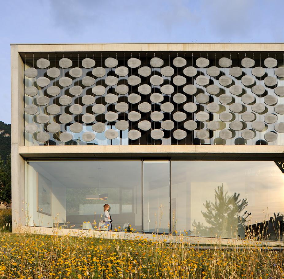 Entirely made of raw concrete, the building echos the cliff and colors of Salève, Haute Savoie.