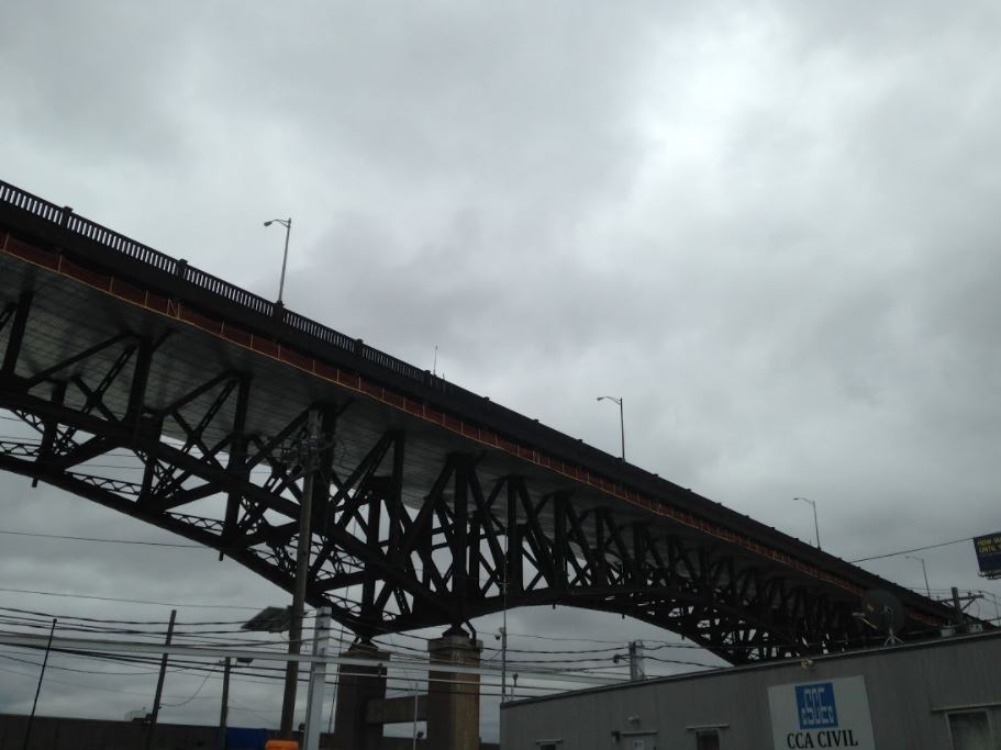 More than 40 meters above the Passaic River, which it crosses with two main spans of 170 meters, the steel structure soars above the industrial suburbs of Jersey City for more than 5.5 kilometers.