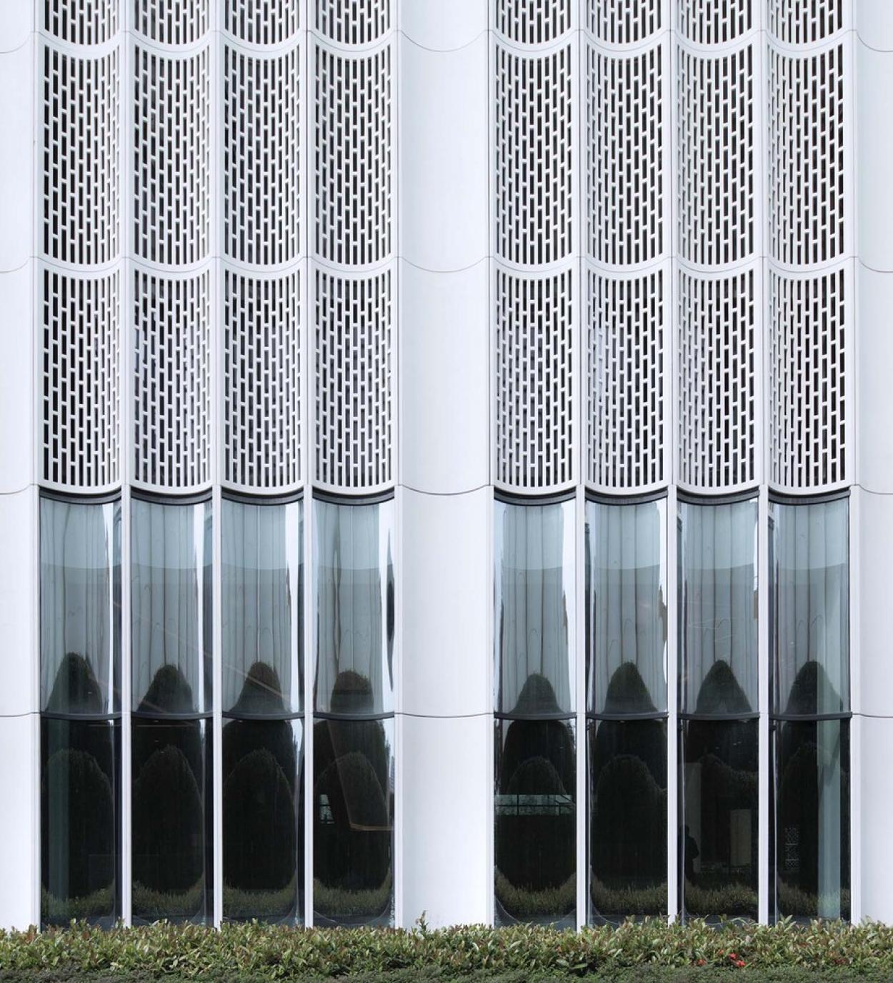 L’étanchéité de la solution Ductal® Enveloppe a permis de concevoir une façade ondulante imperméable, avec une isolation par l’extérieur efficace grâce au système de panneau sandwich. La minéralité de Ductal® se marie parfaitement avec l’aspect végétal voulu par l’architecte.